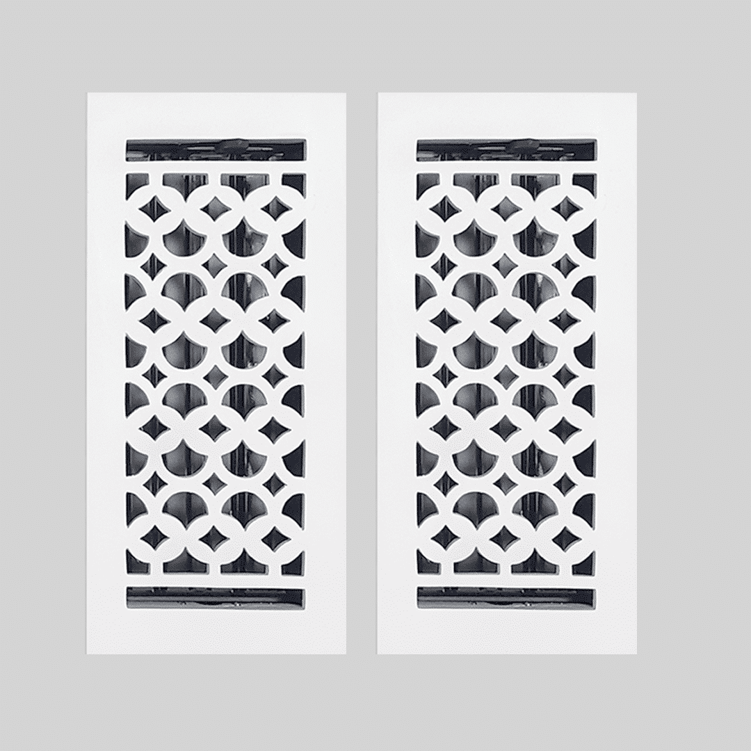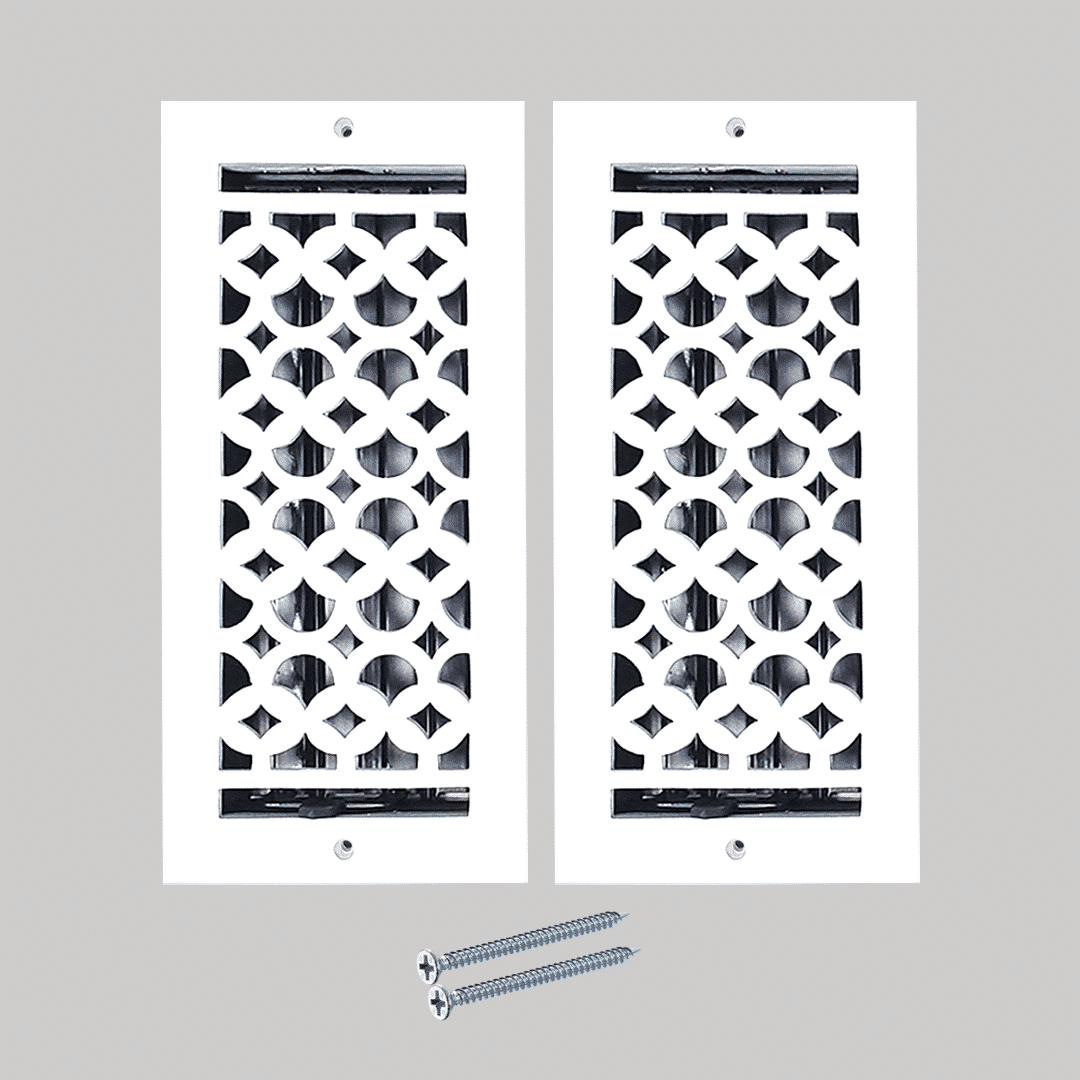 Description Les grilles de ventilation Prima Decorative Hardware sont des grilles de ventilation élégantes de haute qualité, fabriquées à la main en aluminium moulé résistant à la rouille. Elles sont utilisées pour couvrir les ouvertures des conduits de ventilation de sol pour les systèmes de climatisation, de chauffage et de CVC. Notre conception offre un aspect traditionnel et assure un flux d'air chaud ou froid silencieux et sans cliquetis de votre système de climatisation central vers la pièce, tout en offrant une ouverture et une fermeture faciles grâce aux registres attachés à l'arrière. Notre grille de ventilation de 4 po x 10 po, fabriquée et finie à la main, s'adapte à la plupart des ouvertures de conduits d'air standard pour les sols, les murs et les plafonds et est destinée à une utilisation en intérieur. Le matériau utilisé est de l'aluminium moulé durable. Le registre est amovible et réglable pour contrôler le flux d'air et le rendre sûr. Nos grilles de ventilation sont magnifiquement conçues et construites pour durer longtemps. Ces grilles de ventilation ajouteront une touche d'élégance moderne à n'importe quelle pièce pour longtemps. Le nettoyage de la grille de ventilation est très facile. Toutes nos grilles de ventilation sont revêtues de poudre et sont durables. Il suffit de les brosser pour les sécher. Si, après quelques années, vous constatez une différence de couleur, si elles deviennent ternes ou si vous souhaitez les changer de couleur, vous pouvez les repeindre avec une bombe de peinture métallique disponible dans le commerce. Ces grilles de ventilation sont en fonte, idéales pour les zones à fort trafic. Le même modèle est disponible pour les grilles de retour d'air de grande taille pour murs et plafonds, sans registres, avec trous fraisés et vis correspondantes. Garantie fabricant : nos grilles sont garanties 12 mois dans des conditions normales d'utilisation (hors finition/couleur), d'usure normale ou d'utilisation/installation inappropriée.