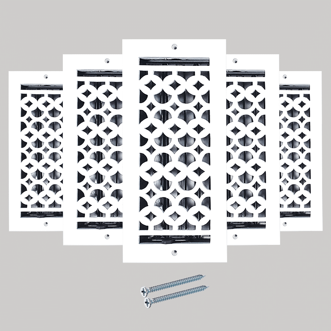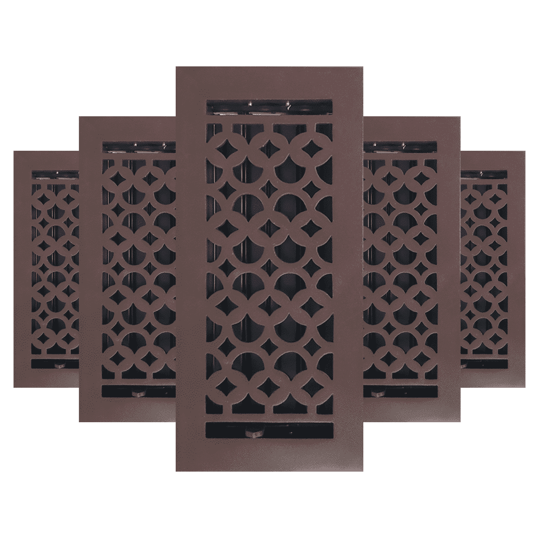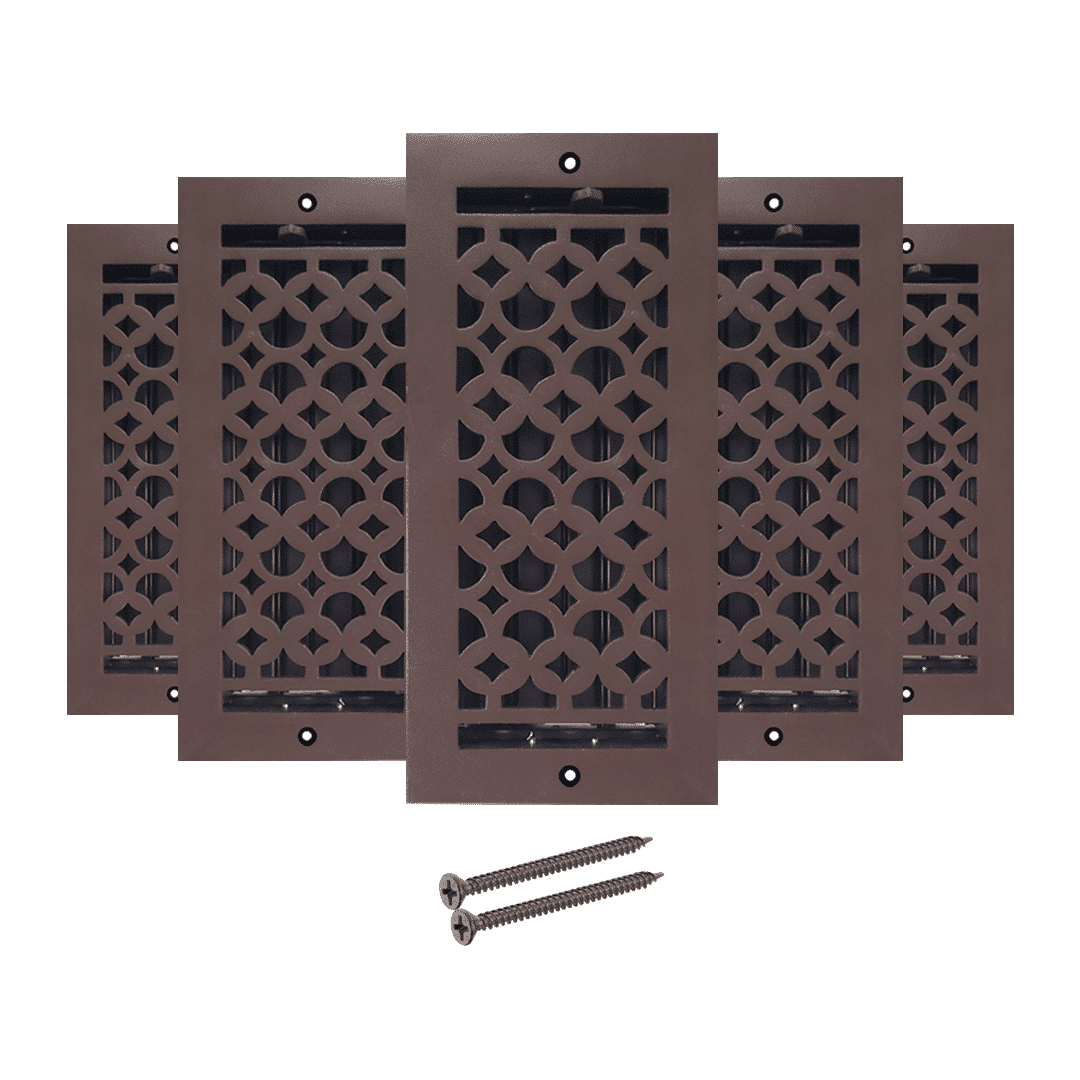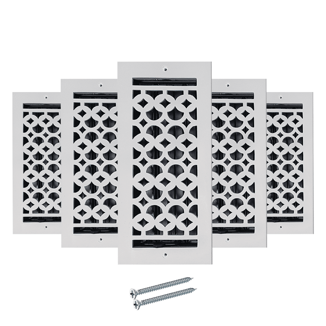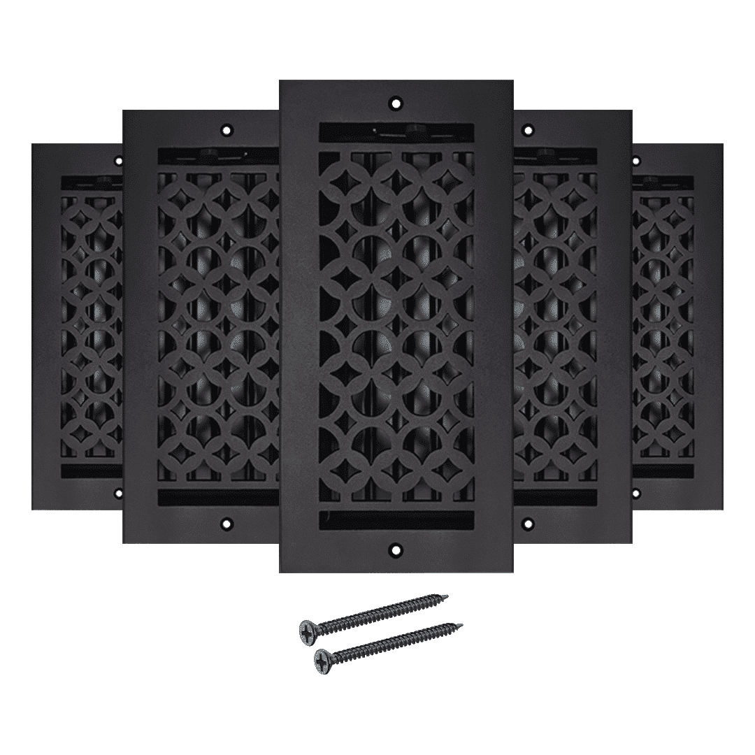 Description Les grilles de ventilation Prima Decorative Hardware sont des grilles de ventilation élégantes de haute qualité, fabriquées à la main en aluminium moulé résistant à la rouille. Elles sont utilisées pour couvrir les ouvertures des conduits de ventilation de sol pour les systèmes de climatisation, de chauffage et de CVC. Notre conception offre un aspect traditionnel et assure un flux d'air chaud ou froid silencieux et sans cliquetis de votre système de climatisation central vers la pièce, tout en offrant une ouverture et une fermeture faciles grâce aux registres attachés à l'arrière. Notre grille de ventilation de 4 po x 10 po, fabriquée et finie à la main, s'adapte à la plupart des ouvertures de conduits d'air standard pour les sols, les murs et les plafonds et est destinée à une utilisation en intérieur. Le matériau utilisé est de l'aluminium moulé durable. Le registre est amovible et réglable pour contrôler le flux d'air et le rendre sûr. Nos grilles de ventilation sont magnifiquement conçues et construites pour durer longtemps. Ces grilles de ventilation ajouteront une touche d'élégance moderne à n'importe quelle pièce pour longtemps. Le nettoyage de la grille de ventilation est très facile. Toutes nos grilles de ventilation sont revêtues de poudre et sont durables. Il suffit de les brosser pour les sécher. Si, après quelques années, vous constatez une différence de couleur, si elles deviennent ternes ou si vous souhaitez les changer de couleur, vous pouvez les repeindre avec une bombe de peinture métallique disponible dans le commerce. Ces grilles de ventilation sont en fonte, idéales pour les zones à fort trafic. Le même modèle est disponible pour les grilles de retour d'air de grande taille pour murs et plafonds, sans registres, avec trous fraisés et vis correspondantes. Garantie fabricant : nos grilles sont garanties 12 mois dans des conditions normales d'utilisation (hors finition/couleur), d'usure normale ou d'utilisation/installation inappropriée.