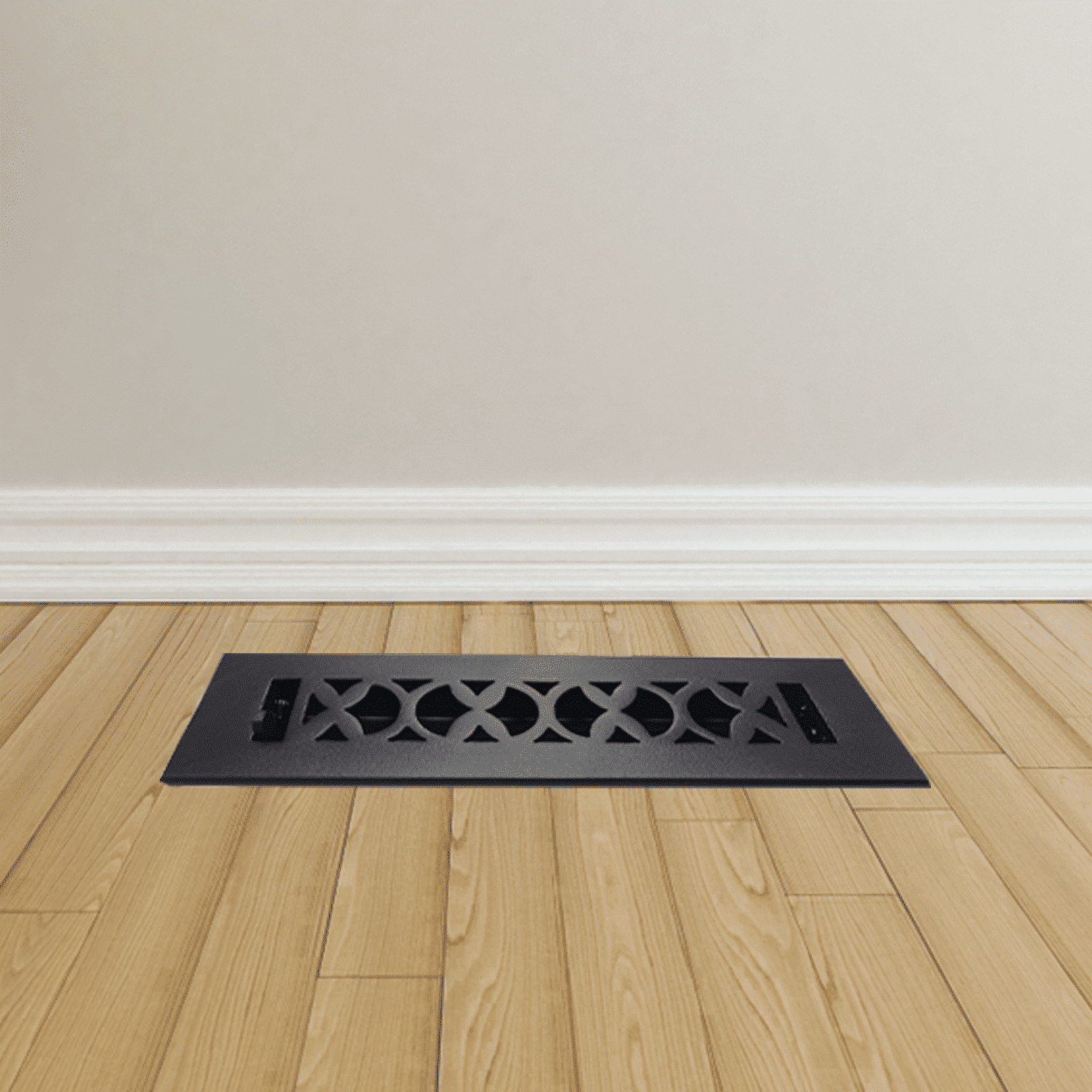 Materials and Finishes: Made of cast aluminum, these floor registers are rust-free. They come with a baked-on powder coat fine-grain matte finish that provides extra protection and can be repainted using metal spray paint to match any decor. It comes in Cast Iron, also.